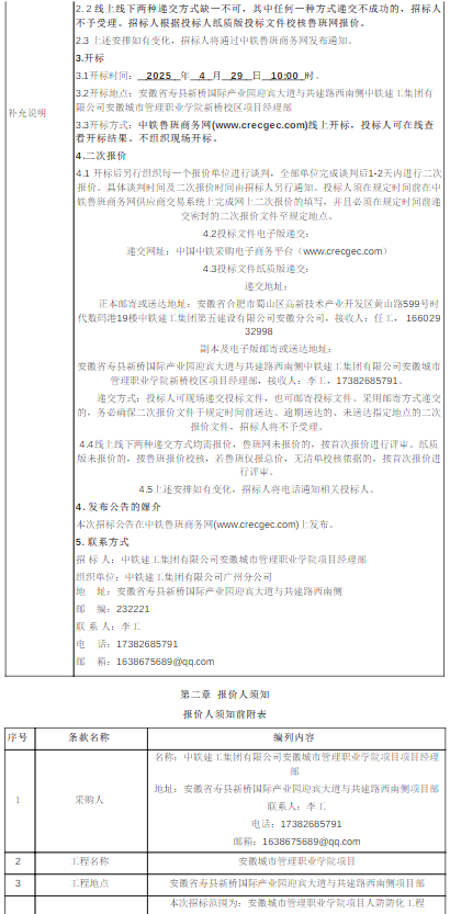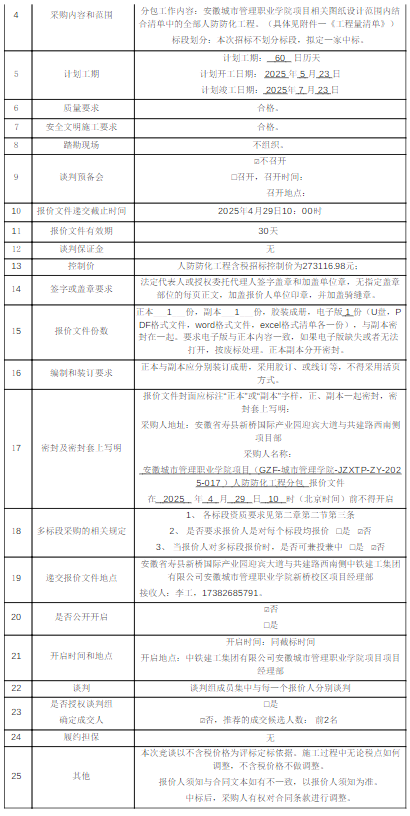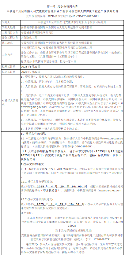 安徽城市管理职业学院项目工程中铁建工集团有限公司人防防化工程谈判公告江苏省