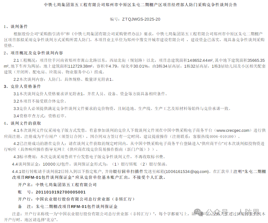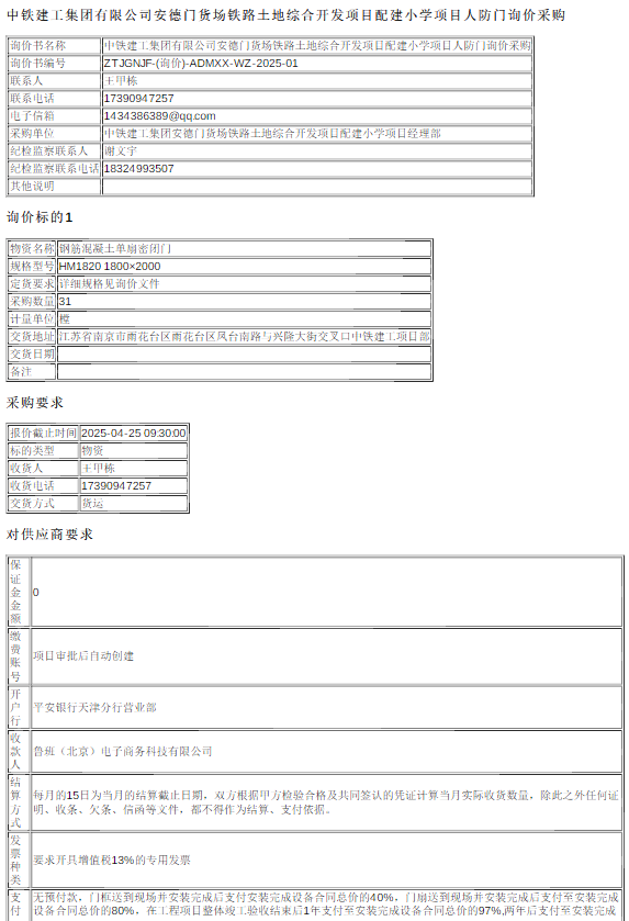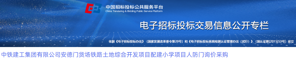 中铁建工集团有限公司安德门货场铁路土地综合开发项目配建小学项目人防门询价采购河南省