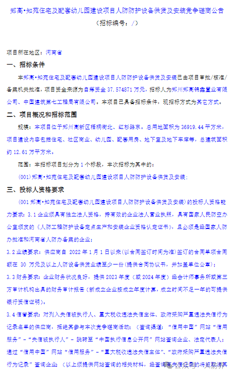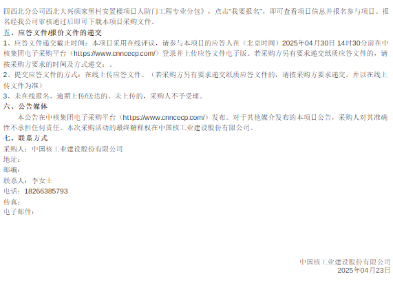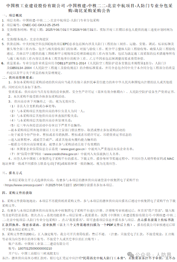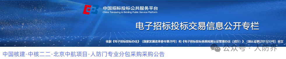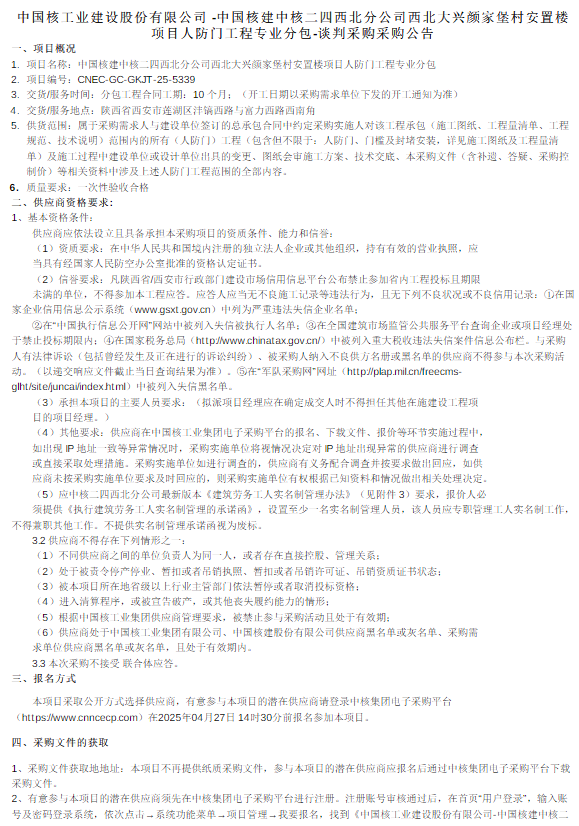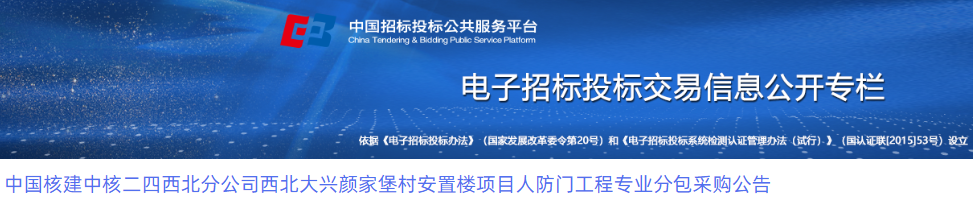 中国核建中核二四西北分公司西北大兴颜家堡村安置楼项目人防门工程专业分包采购公告文章推荐: