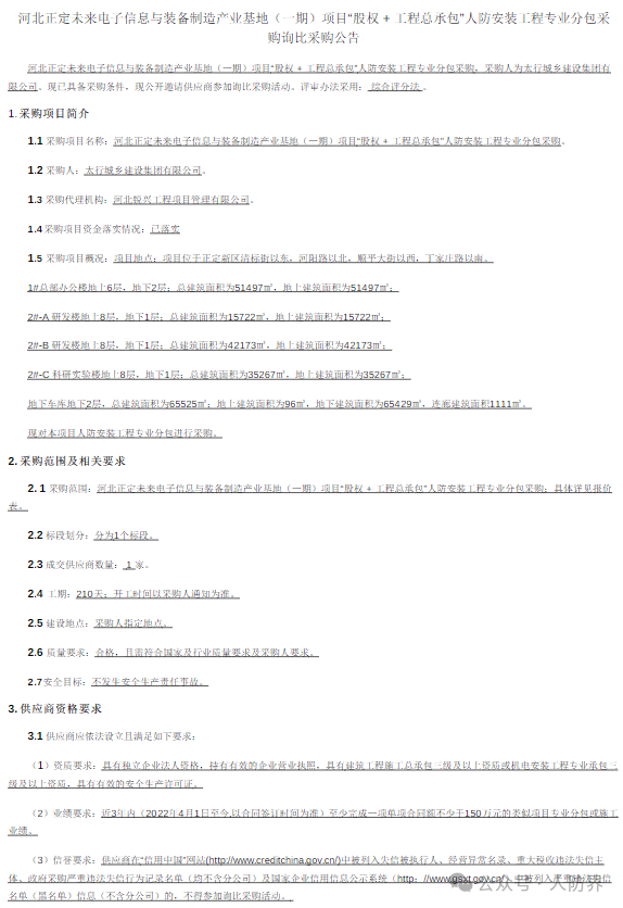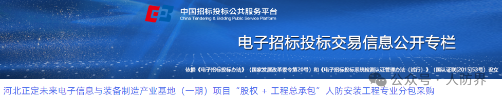 河北正定未来电子信息与装备制造产业基地(一期)项目股权 + 工程总承包人防安装工程专业分包采购