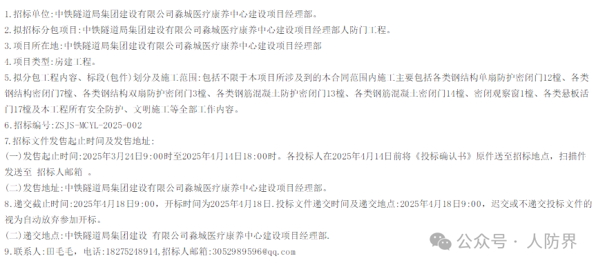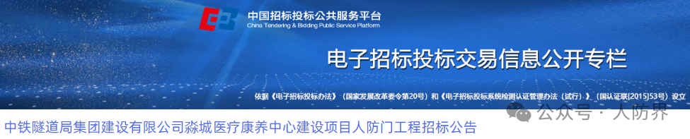 中铁隧道局集团建设有限公司淼城医疗康养中心建设项目人防门工程招标公告浙江省