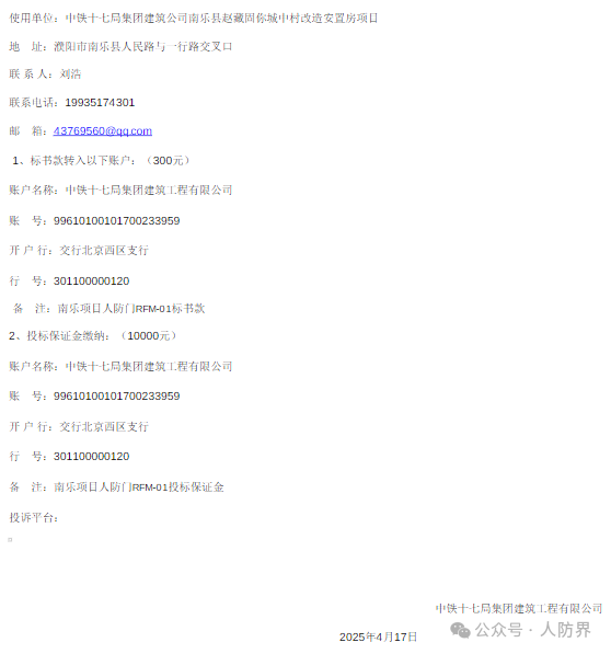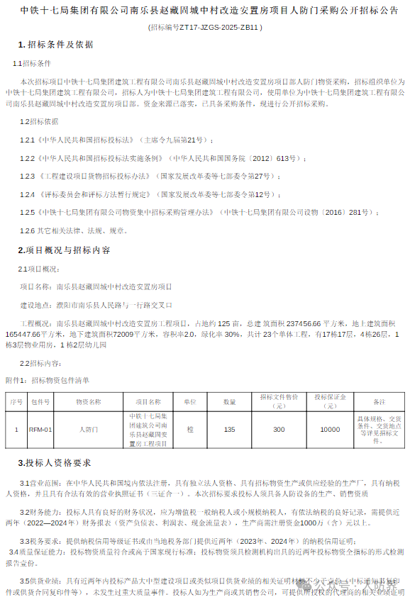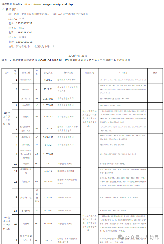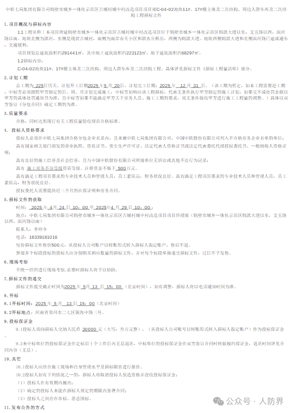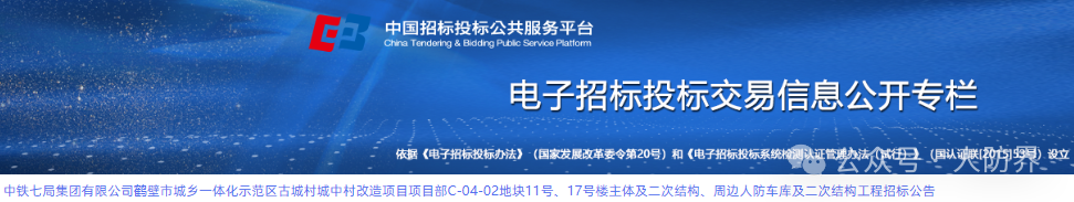 中铁七局集团有限公司鹤壁市城乡一体化示范区古城村城中村改造项目项目部C-04-02地块11号、17号楼主体及二次结构、周边人防车库及二次结构工程招标公告天津市